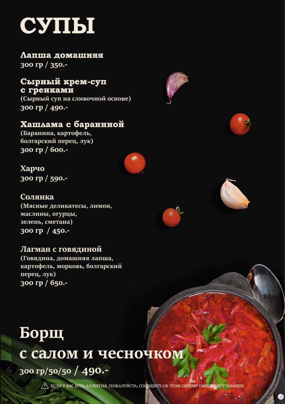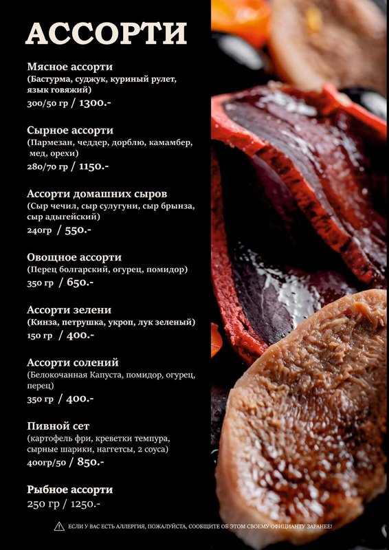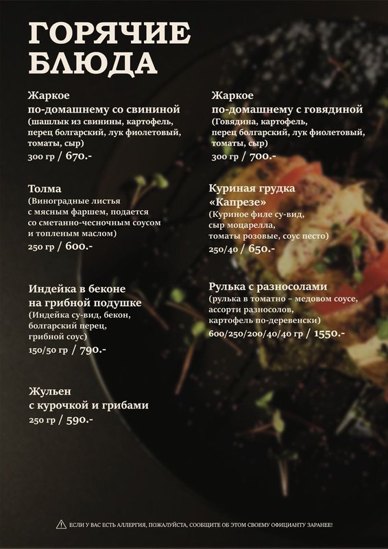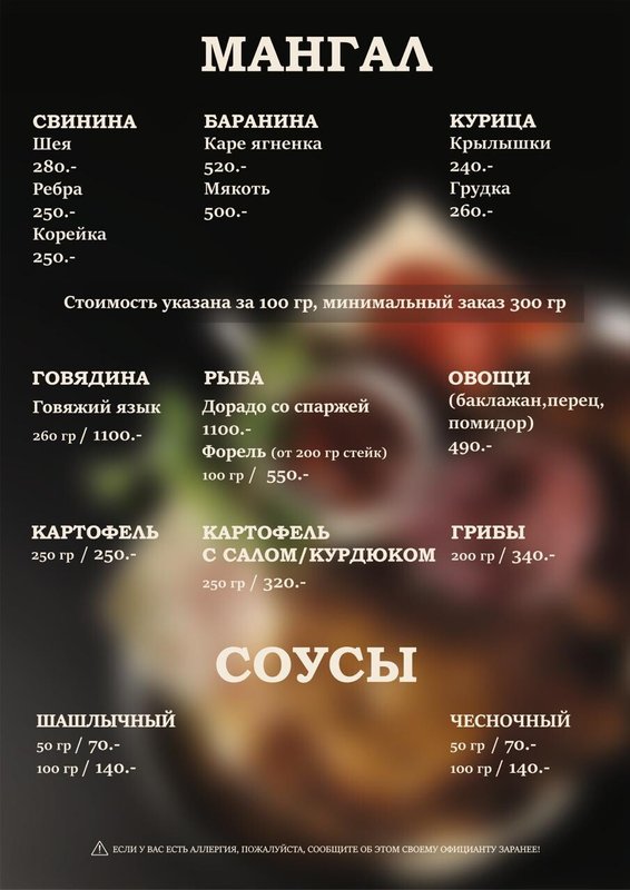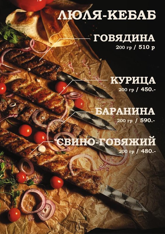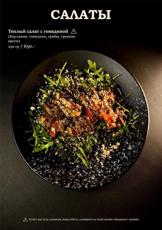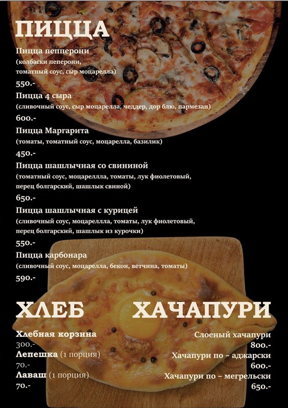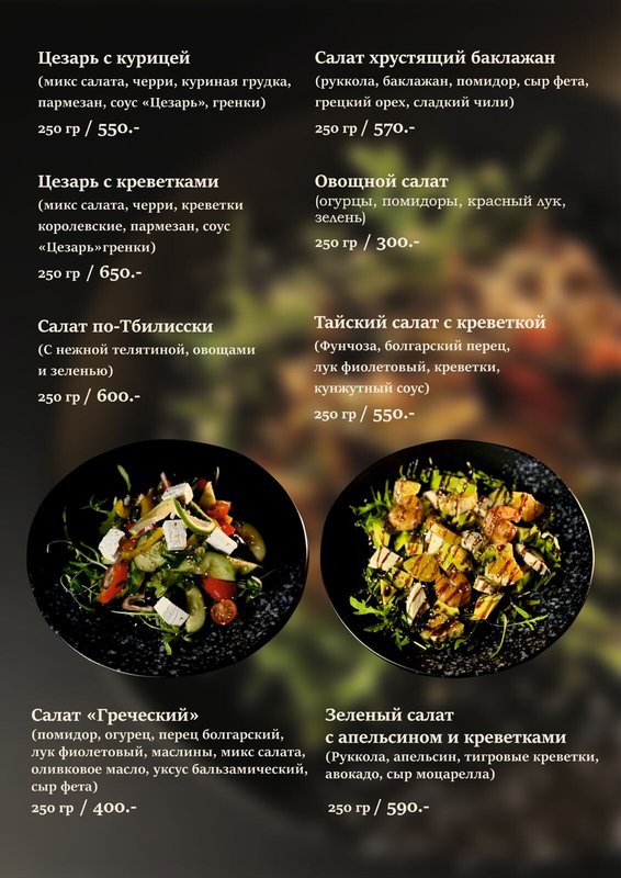 Мы предлагаем блюда кавказской (а именно грузинской), европейской кухни, из которых самой популярной, пожалуй, является европейская. Наши повара знают, как правильно сохранить натуральный вкус основных ингредиентов (мяса, рыбы, овощей), не перебивая его вкусом специй.